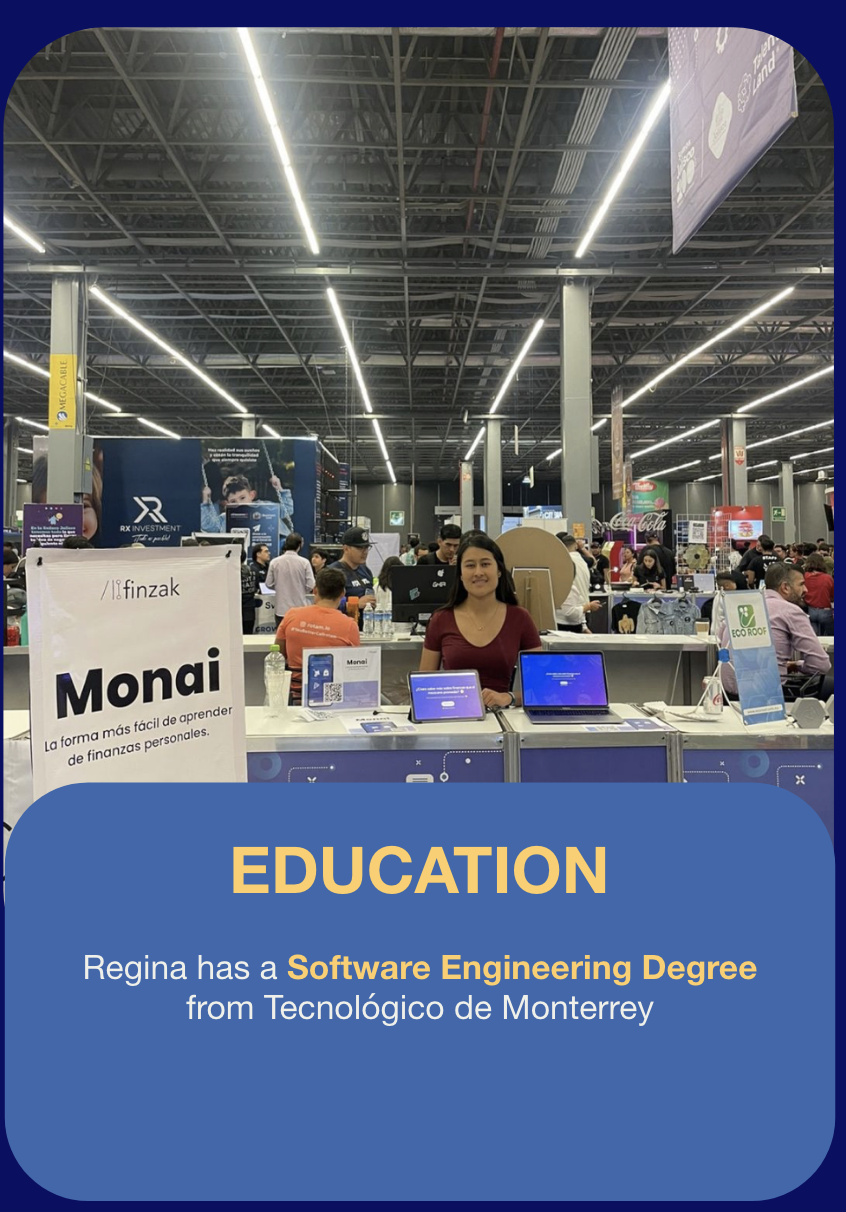 Regina is the Founder and CEO of Monai, an online financing platform for young adults across Mexico. Regina is also the Founder of ‘Mundatus’, an online community focused on promoting environmentally sustainable practices. Mundatus opened an online store where they sell eco-friendly hygiene products.